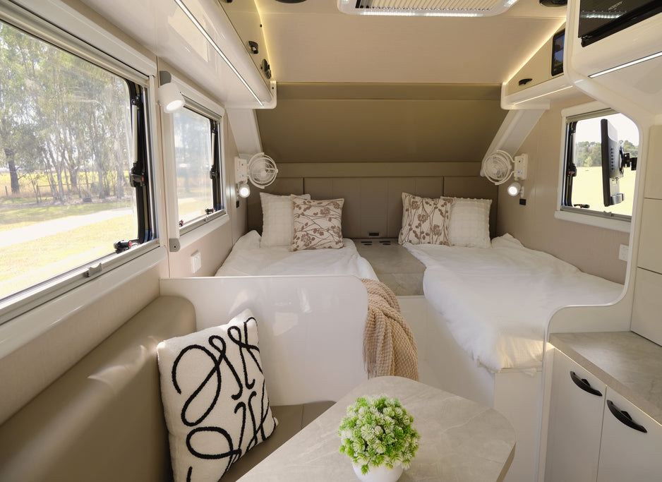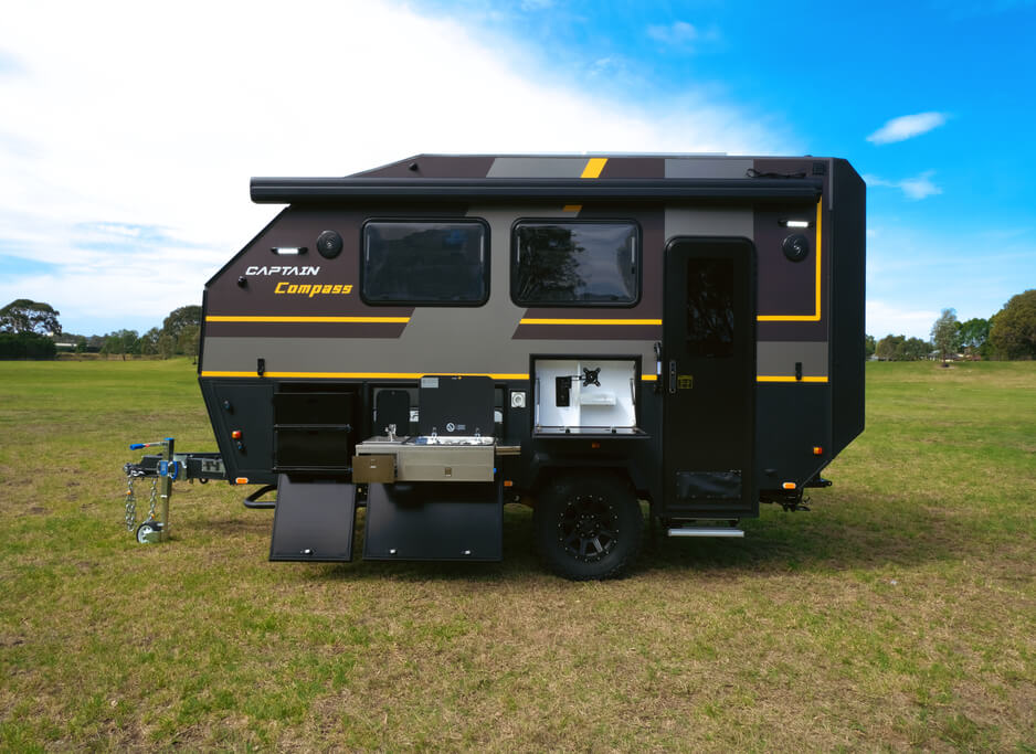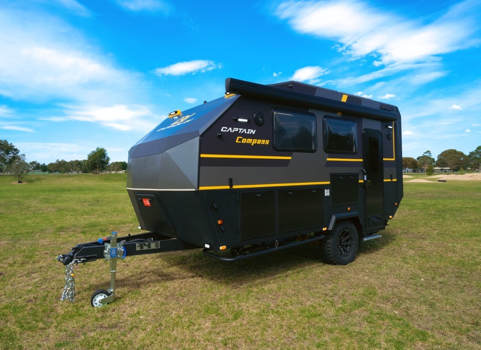 Experience the MY25 Captain Compass, a 12-foot caravan with a space-maximizing design offering 14 feet of interior space.
