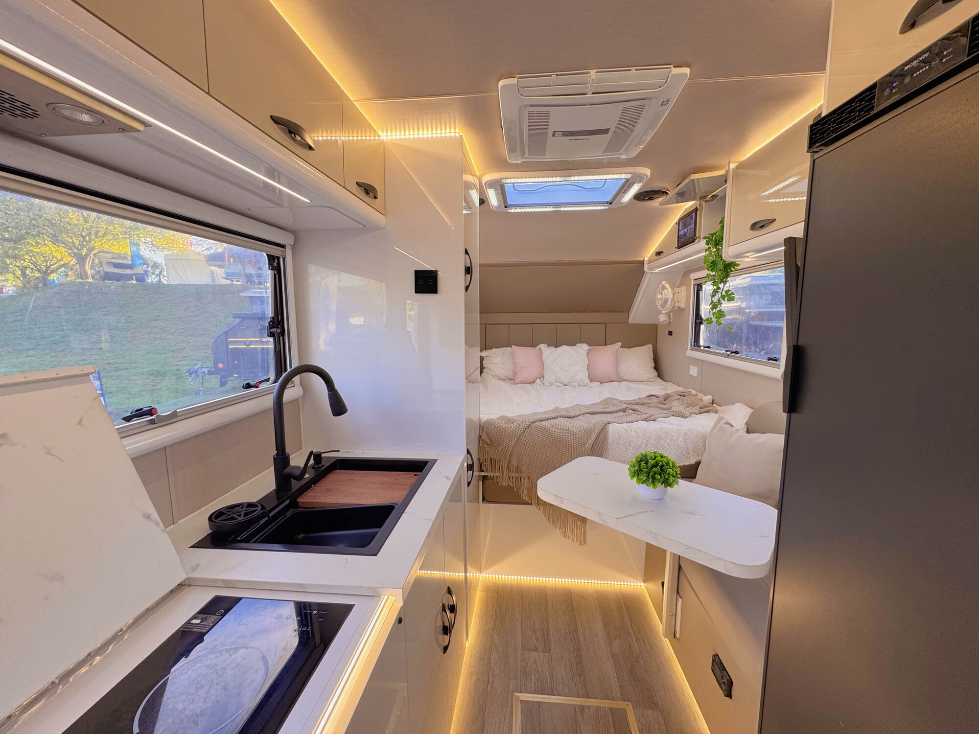 - Ultimate Kitchen: Internal induction cooktop , external pull-out kitchen, Internal fridge, microwave.