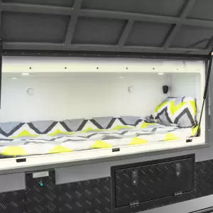 It only takes minutes to set up. The electric roof makes your life easy and simple. Heavy-duty alloy rims which are solid and stable make your camping adapt to various environments. Besides, it has a 400W roof-mounted flexible solar panel, which is environmental-friendly and economical.