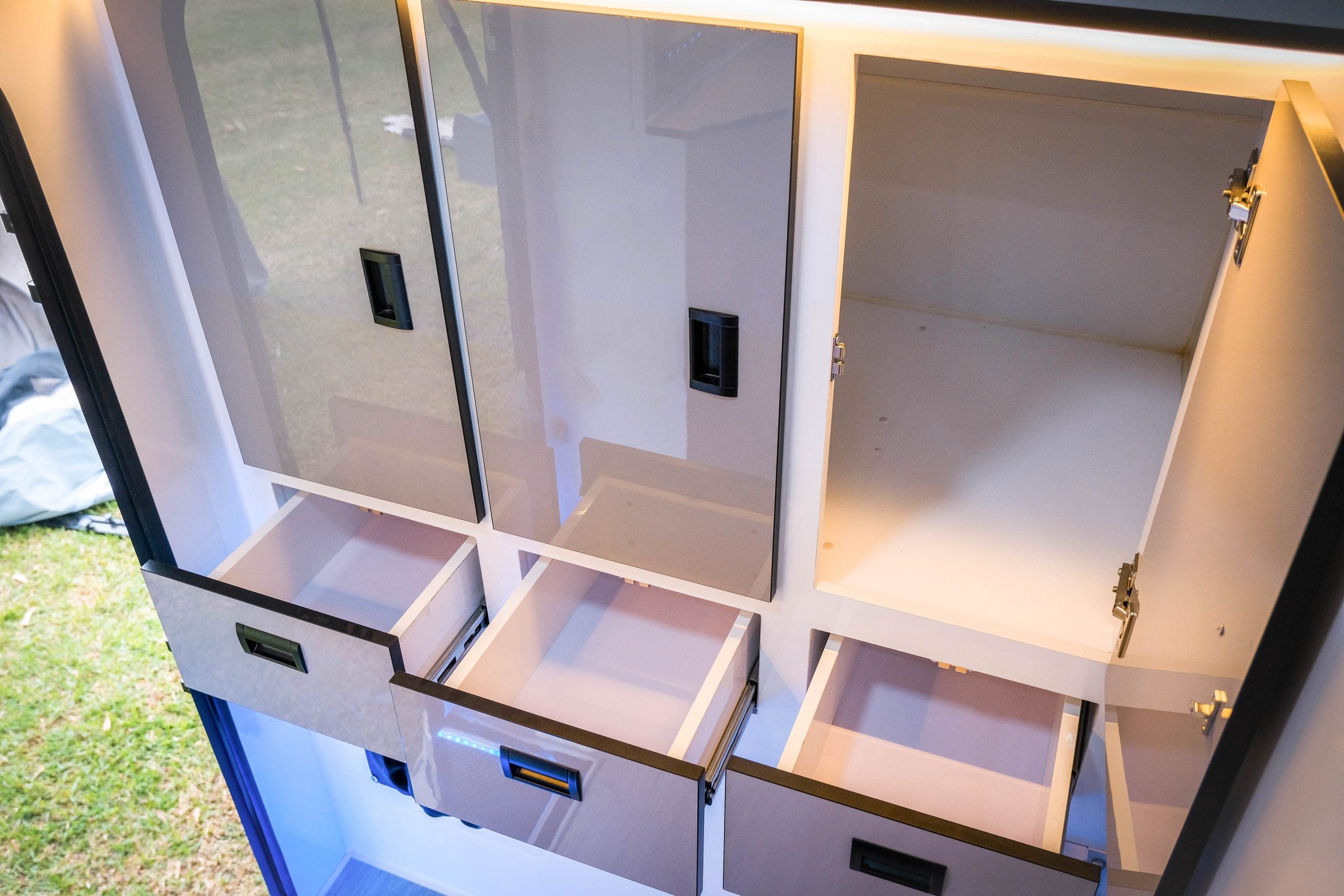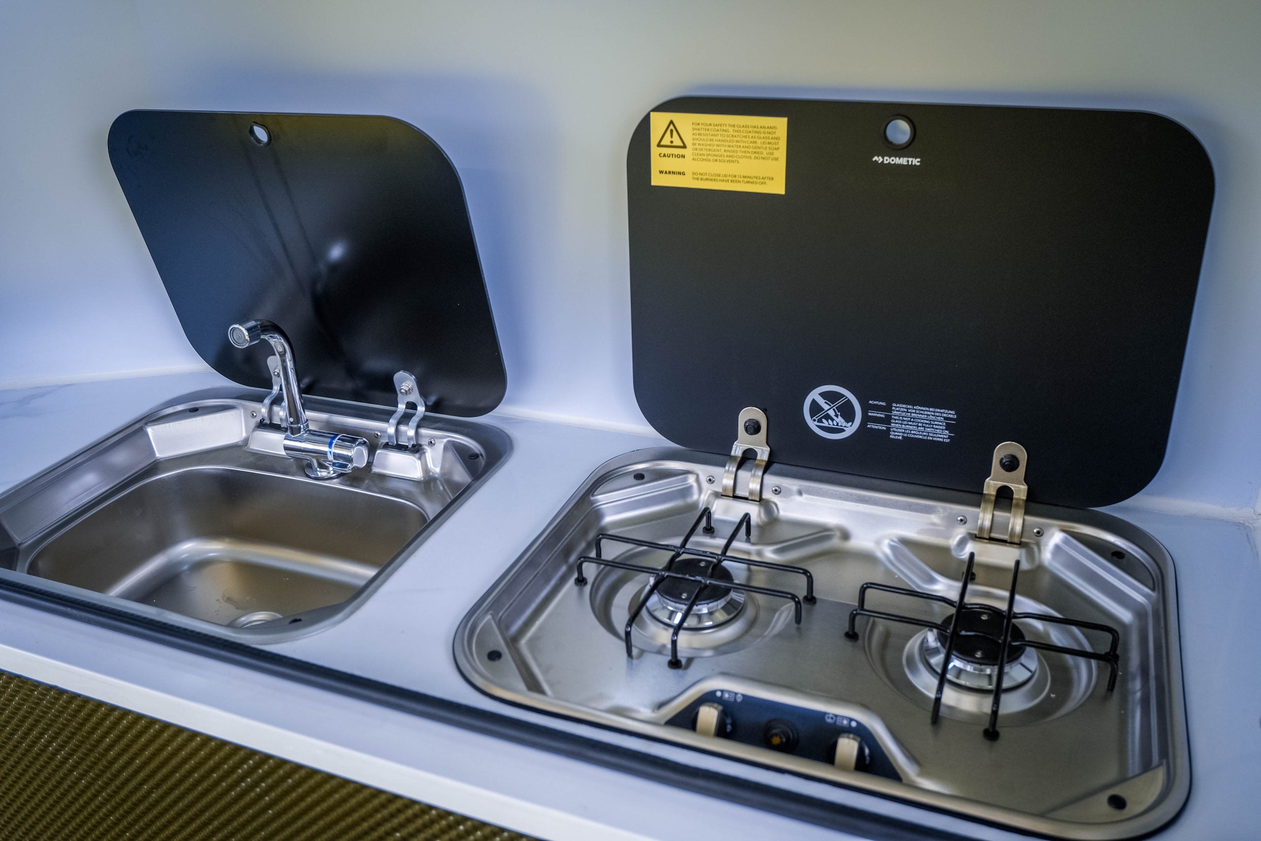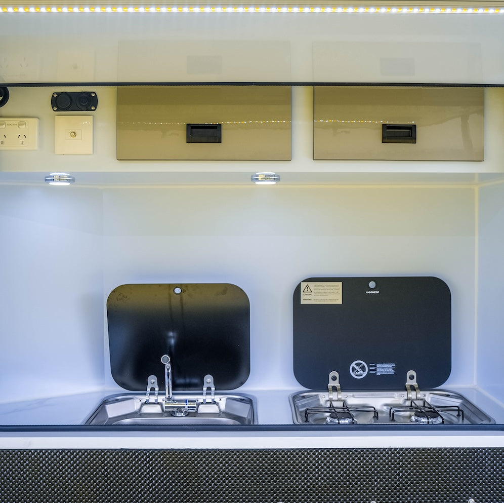 The outdoor kitchen is spacious and organized. Provided with a Dometic 2 LPG Gas Burner Cooktop, it can serve your whole family well. Gas cooking is also great for you cooking professionally.